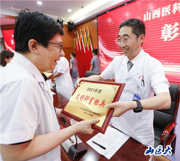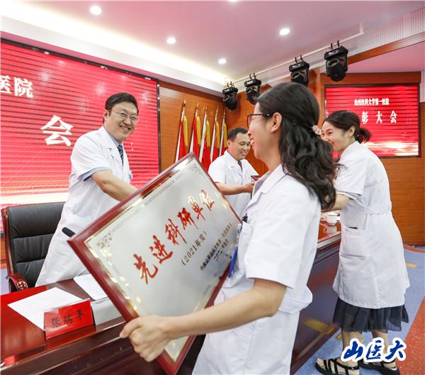 会上,党委副书记吴旭东宣读了2022年“两优一先”表彰决定;党委委员、纪委书记武瑞明宣读了受山西省卫健委表彰的“党建品牌”优秀案例名单,以及《山西省人力资源和社会保障厅 山西省卫生健康委员会关于给予刘虹同志记大功奖励的决定》;党委委员、副院长范双民宣读了2021年度先进集体和先进个人的表彰决定;副院长韩清华宣读了文明科室标兵、文明科室和文明职工的表彰决定。全体院领导为受到表彰的先进集体、先进个人代表颁发了奖牌和证书。