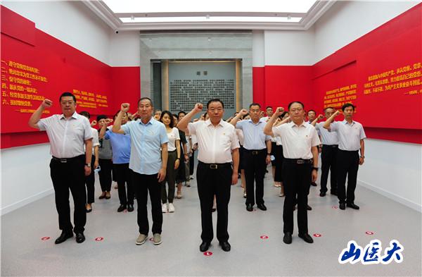 全体参展党员干部来到宣誓厅,在李保的带领下,面对鲜红的党旗,举起右拳,重温了入党誓词。
