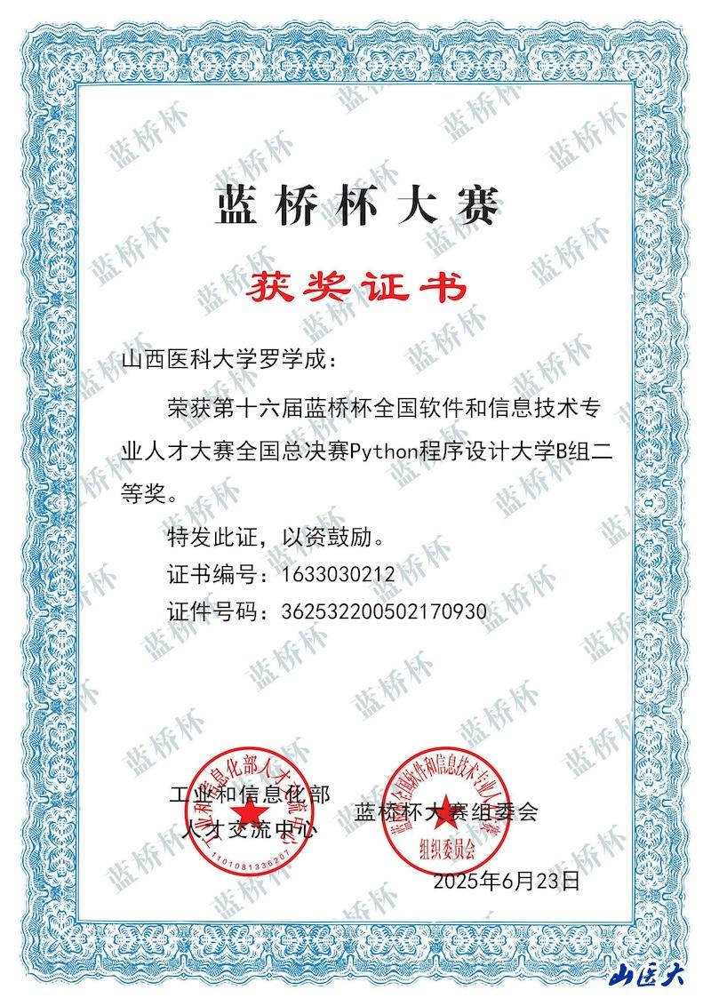 经过省赛和区域赛的激烈角逐,共有1200余名优秀选手进入全国总决赛。涵盖算法设计、程序开发、嵌入式系统等多个技术方向,旨在全面考察选手的专业能力与创新实践水平。罗学成同学选择了Python B赛道,专注于算法设计竞赛。比赛中面对复杂的编程挑战,凭借扎实的基础知识和出色的逻辑思维能力,最终斩获全国二等奖。蓝桥杯大赛由工业和信息化部人才交流中心主办,是面向全国高校大学生的IT类学科竞赛,连续多年入选中国高等教育学会《全国普通高校学科竞赛排行榜》(2023年位列第27位),也是武书连本科高校学科竞赛获奖采集数据源。此次竞赛展示了我校学子在信息技术领域的卓越实力。学校将进一步完善“以赛促学、以赛促建”的育人机制,通过在计算机、人工智能等相关赛事中的持续参与与深耕,力争取得更加优异的成绩。