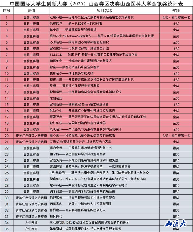 7月24日,中国国际大学生创新大赛(2025)山西赛区总决赛在中北大学圆满落幕,我校共获得金奖21项,银奖14项,其中“高教主赛道”金奖19项,“青年红色筑梦之旅赛道”金奖2项,获得金奖数量再创历史新高,展现了我校在创新创业教育领域的强劲实力。