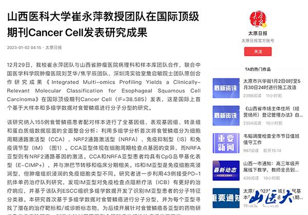 12月29日,我校崔永萍团队与山西省肿瘤医院病理科和样本库团队合作,联合中国医学科学院肿瘤医院刘芝华/焦宇辰团队、深圳湾实验室詹启敏院士团队原创合作研究成果《Integrated Multi-omics Profiling Yields a Clinically-Relevant Molecular Classification for Esophageal Squamous Cell Carcinoma》在国际顶级期刊Cancer Cell(IF=38.585)发表,这是国际上首个基于大样本和多组学数据对食管鳞癌进行分子分型的研究。